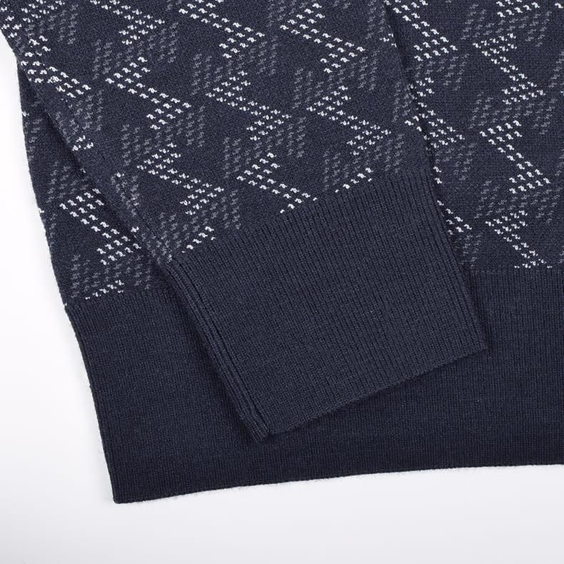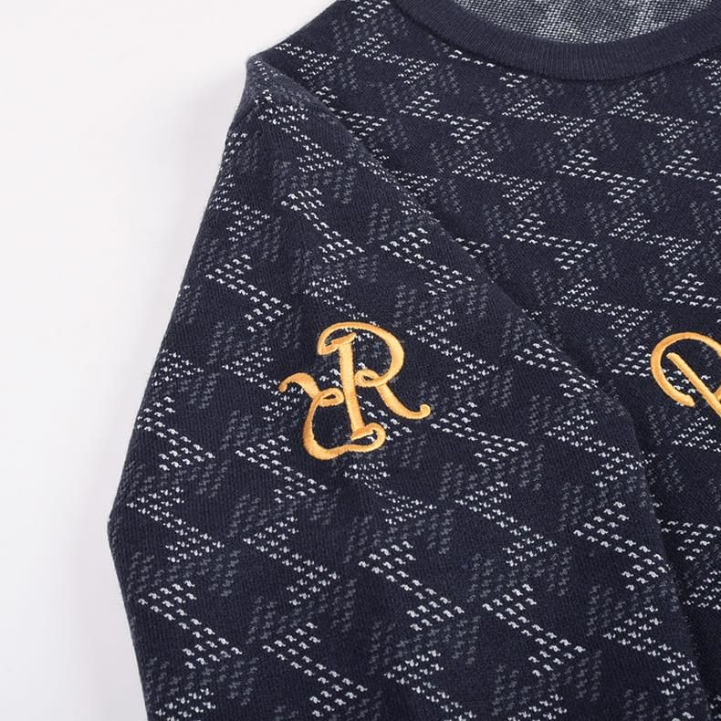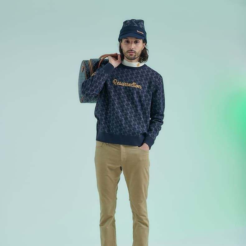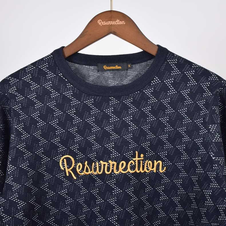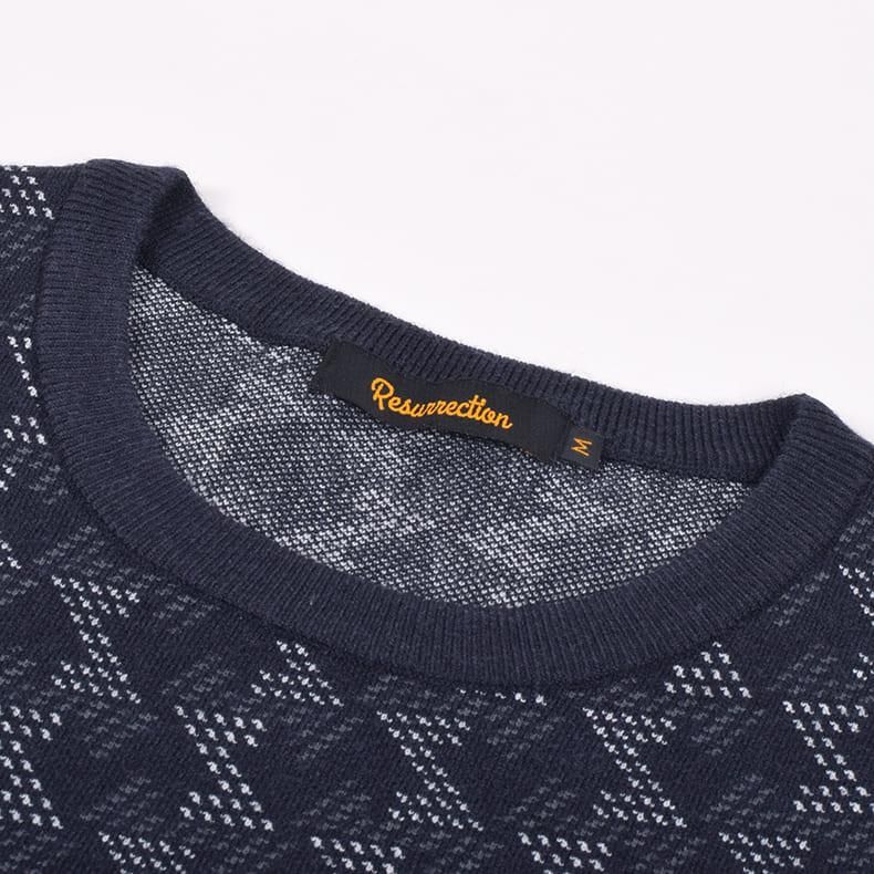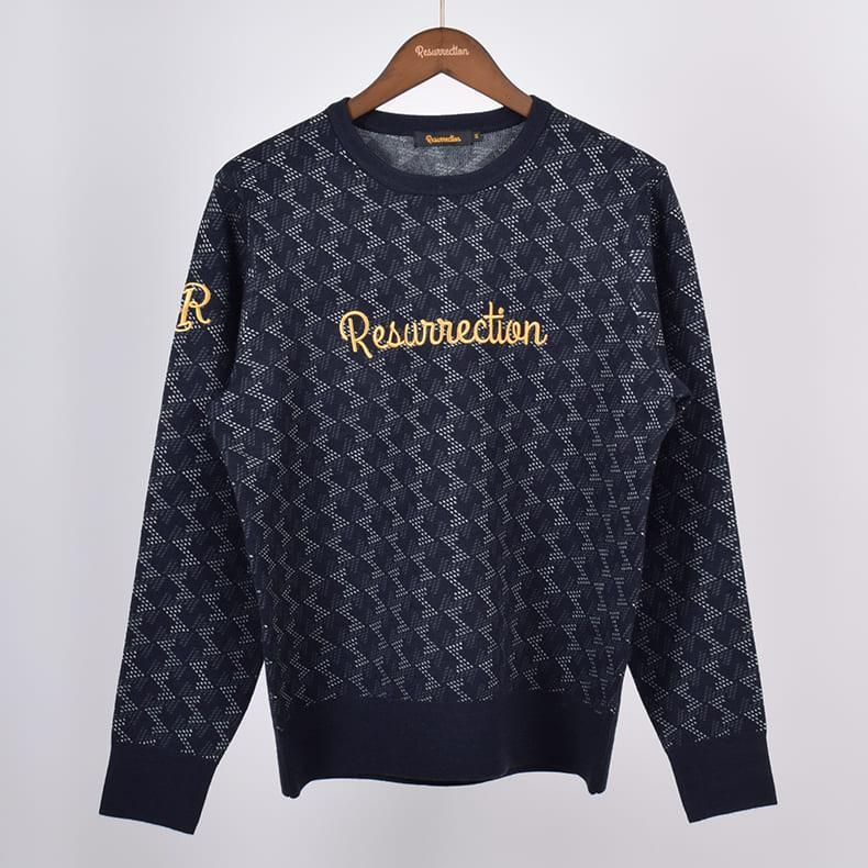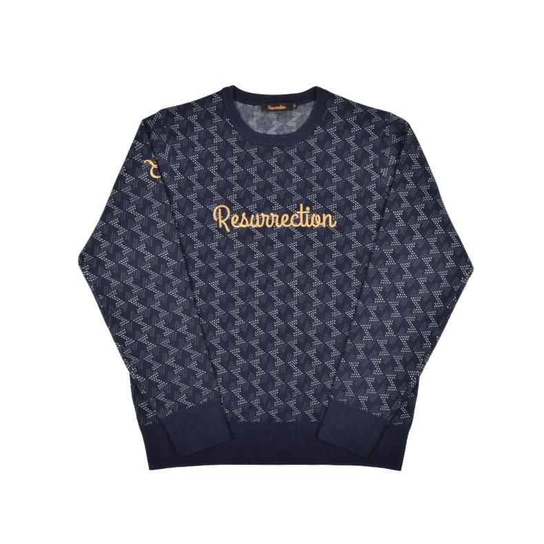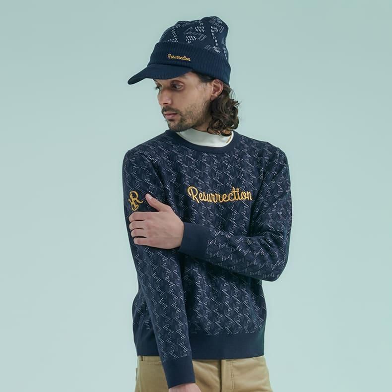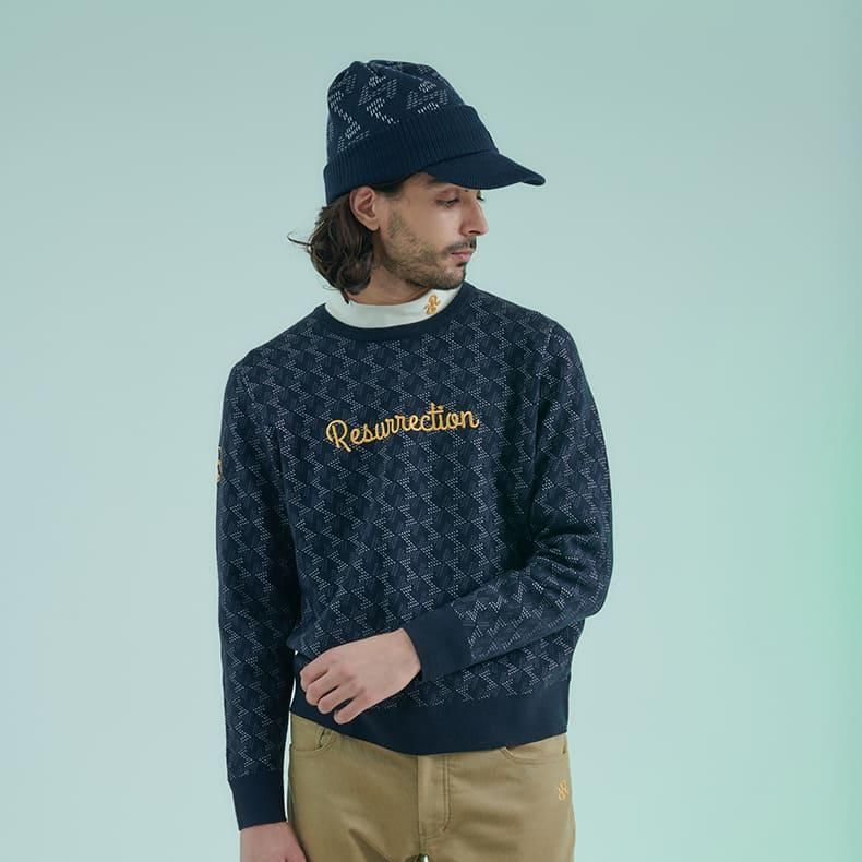 レザレクションが持つクラシカルな雰囲気の幾何学模様をニット素材に落とし込むことにより、どこか温かみのあるセーターに仕上げました。