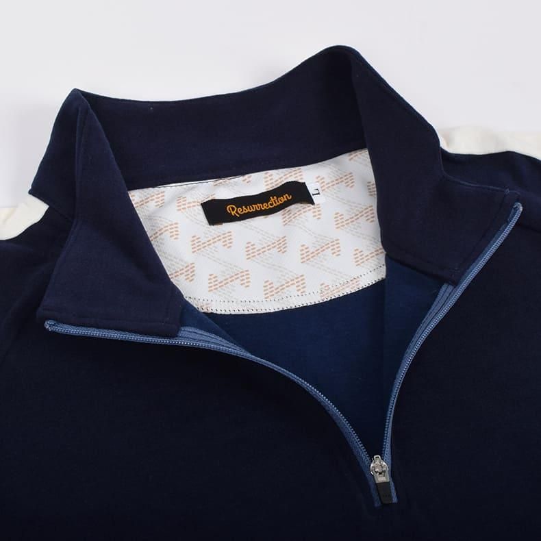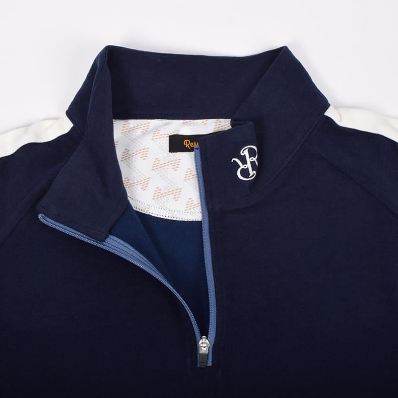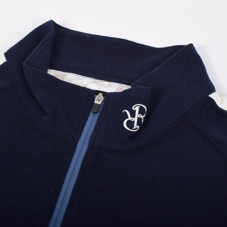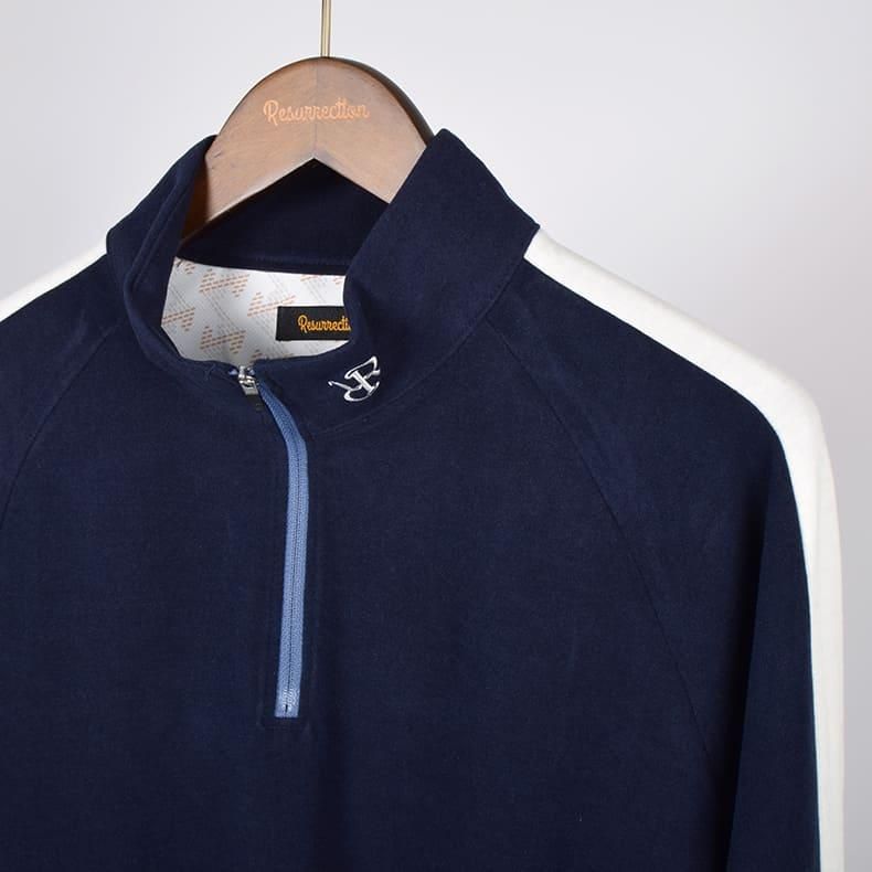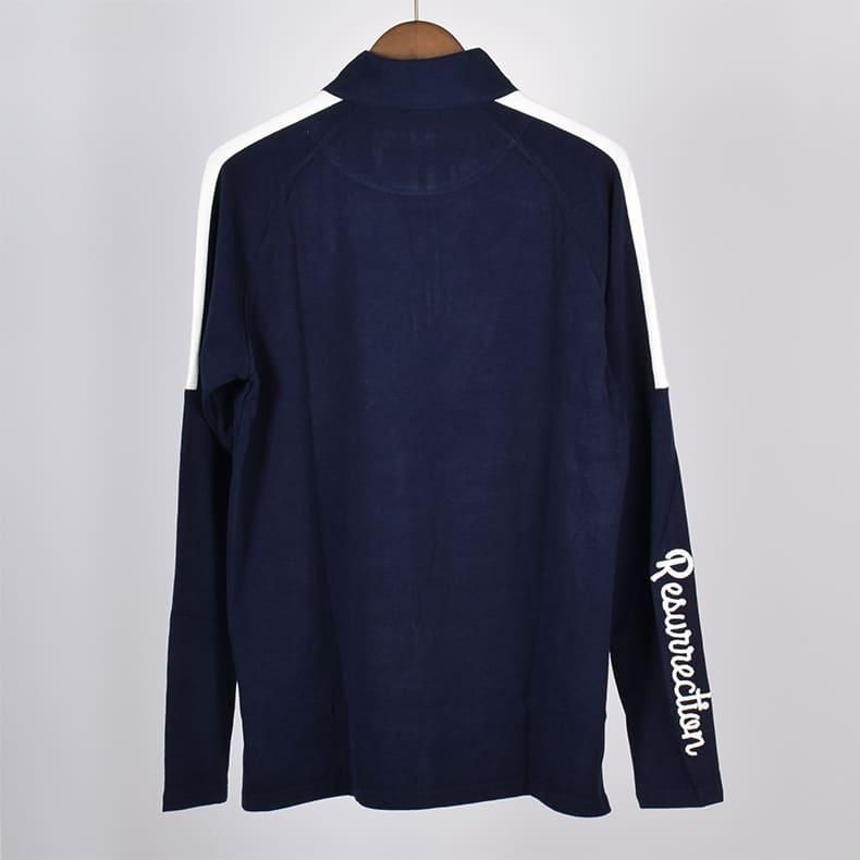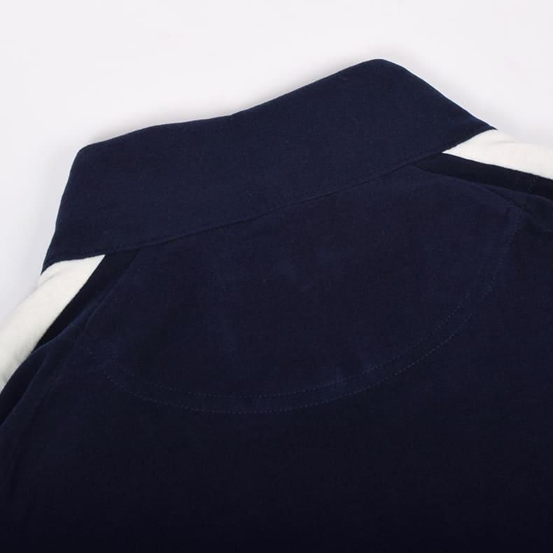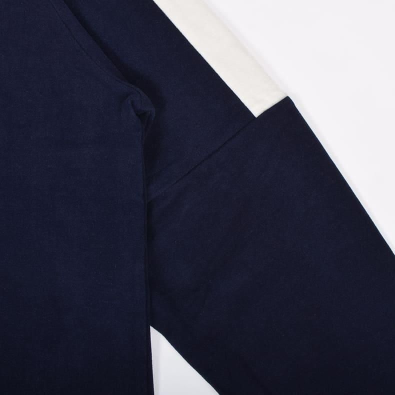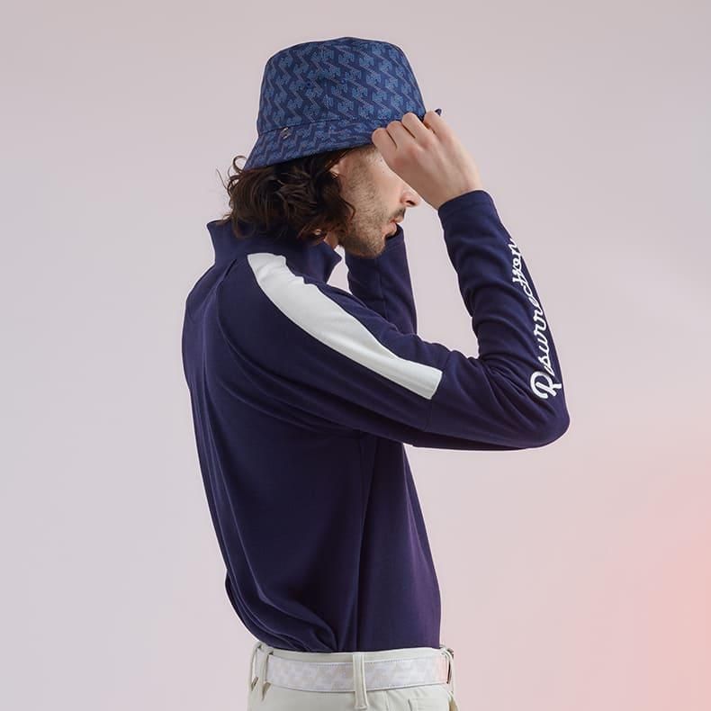 肩部分にバイカラーでデザインされたラインがスポーティーな印象。右腕にはチェーンステッチでブランドロゴを表現したデザイン。表情のあるロゴは高級感がありお客様、スタッフからも人気の拘りポイントとなっております。