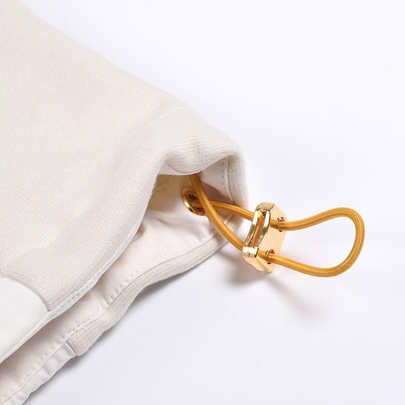 脇下にはアクセントにもなっている異素材の生地で大胆な切り返しを。見た目にも普通過ぎないポイントになっています。後の右脇部分にはレザレクションロゴをデザインしブランド感をプラスしました。イエローのドローコードもさりげない差し色になってくれています。