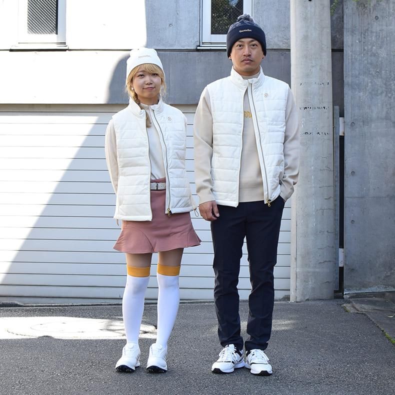いつものメンバーとのゴルフでも、アウターはベストで固定。インナーだけ変えれば新鮮な印象に。薄手の長袖から厚手のニットまで、種類を選ばず上から羽織れるので真冬も重宝しそうです。