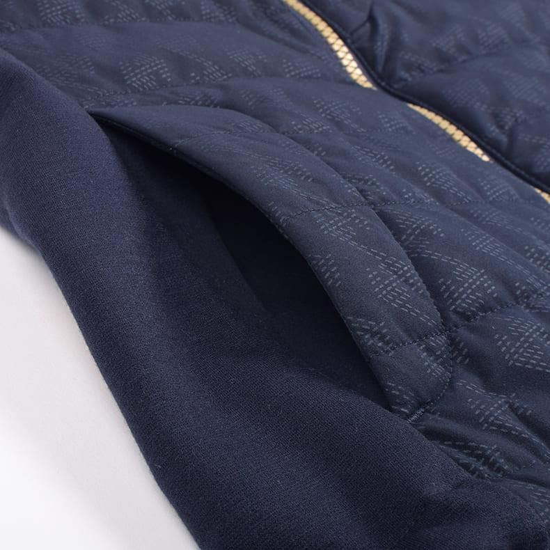 前身頃、後ろ身頃の表生地には、幾何学模様は生地の動きや光のあたりかたによって、キラッとさりげなく柄が浮き上がるエンボス加工を採用。主張しすぎないように、けれどコーディネートの華となるような絶妙な存在感が魅力です。