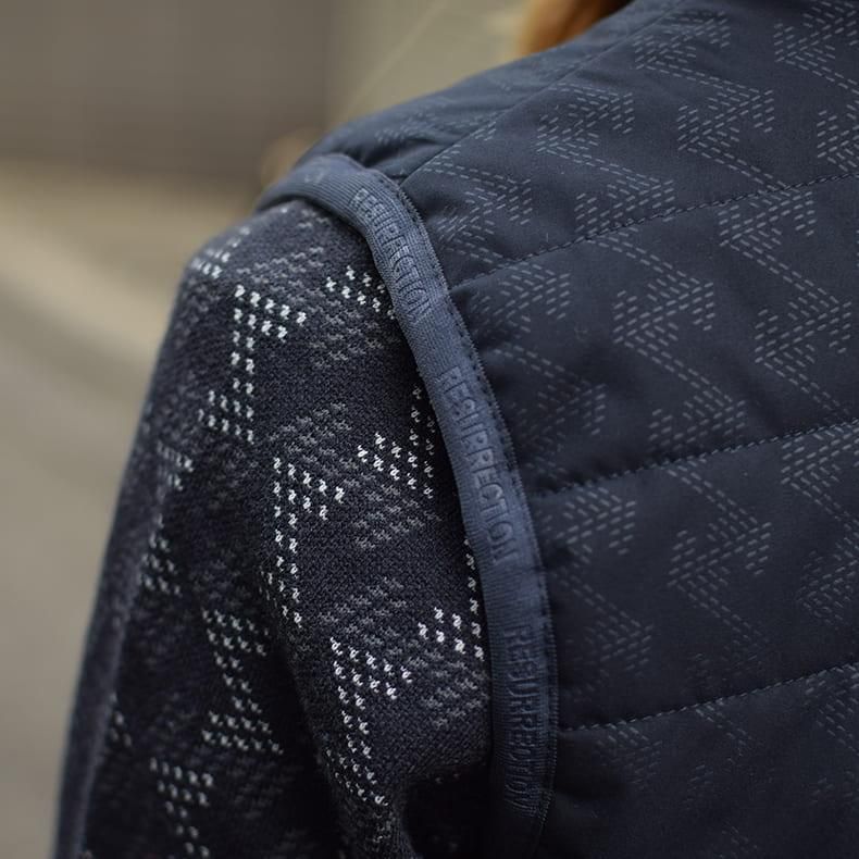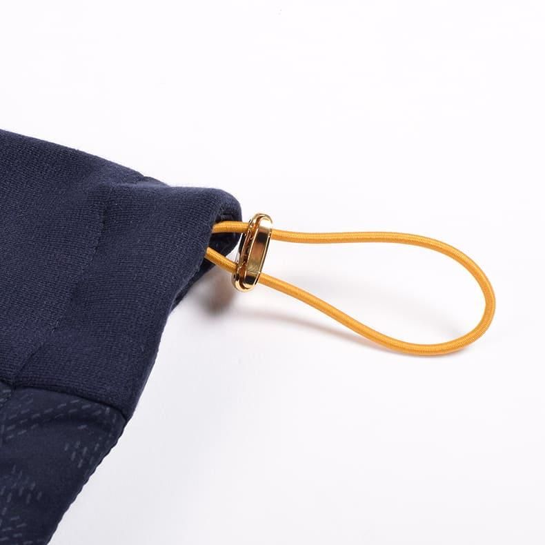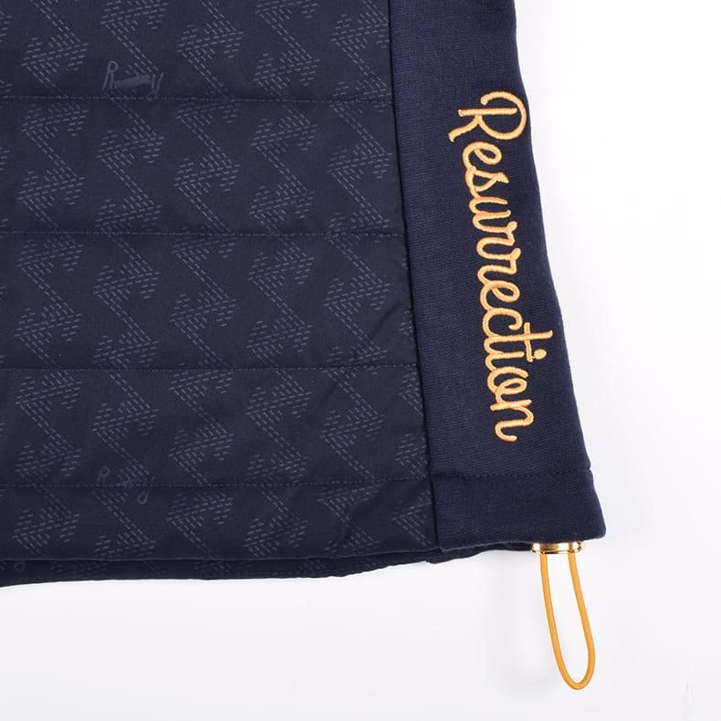 脇下にはアクセントにもなっている異素材の生地で大胆な切り返しを。見た目にも普通過ぎないポイントになっています。後の右脇部分にはレザレクションロゴをデザインしブランド感をプラスしました。イエローのドローコードもさりげない差し色になってくれています。