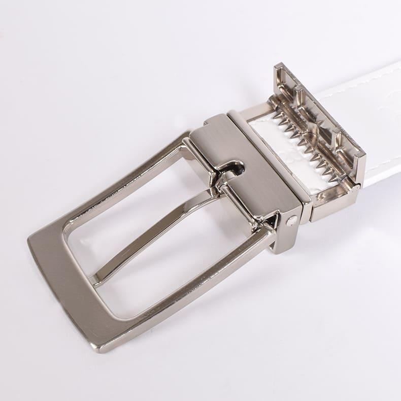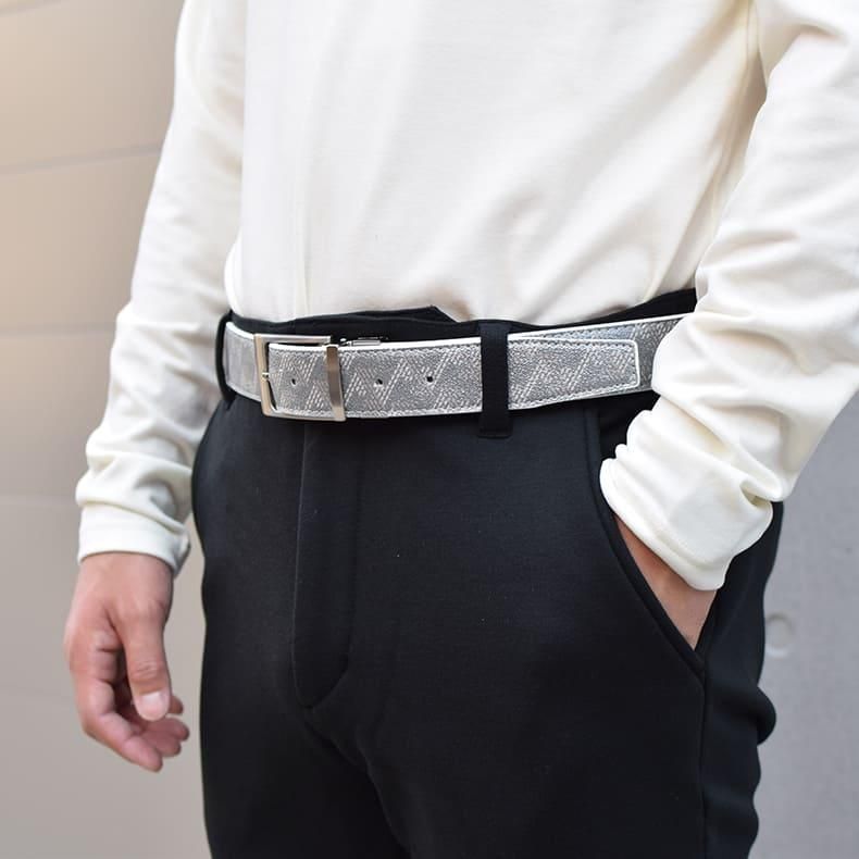 シンプルなコーディネートの日は、ベルトを主役に幾何学模様の面を。