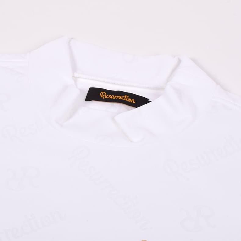 シンプルで合わせやすいけれど普通すぎない今回のモックネック。特徴はなんといってもジャガード編みで表現したレザレクションオリジナルのロゴモノグラム。
