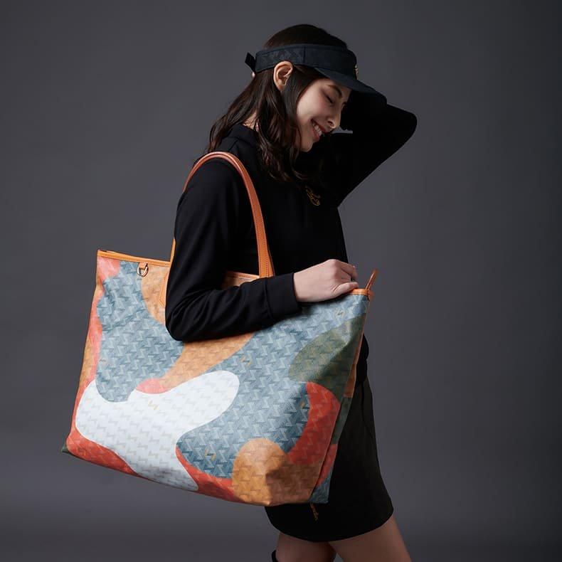 メインボディには、幾何学模様をあしらったレザレクションらしいデザイン。幾何学模様は生地の動きや光のあたりかたによって、キラッとさりげなく柄が浮き上がるエンボス加工を採用。