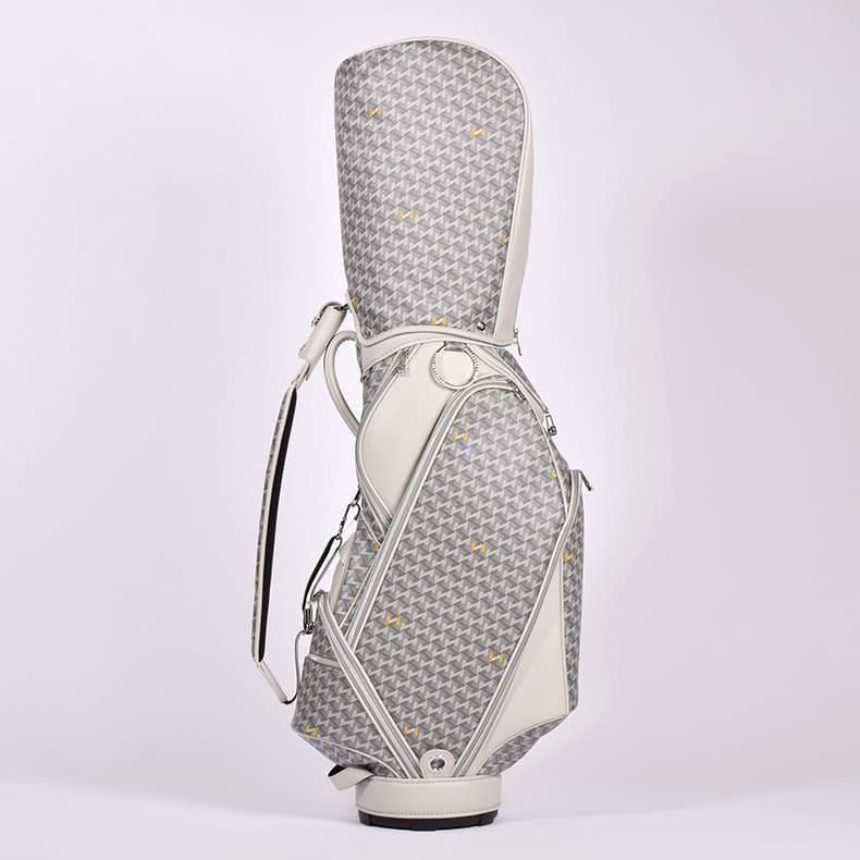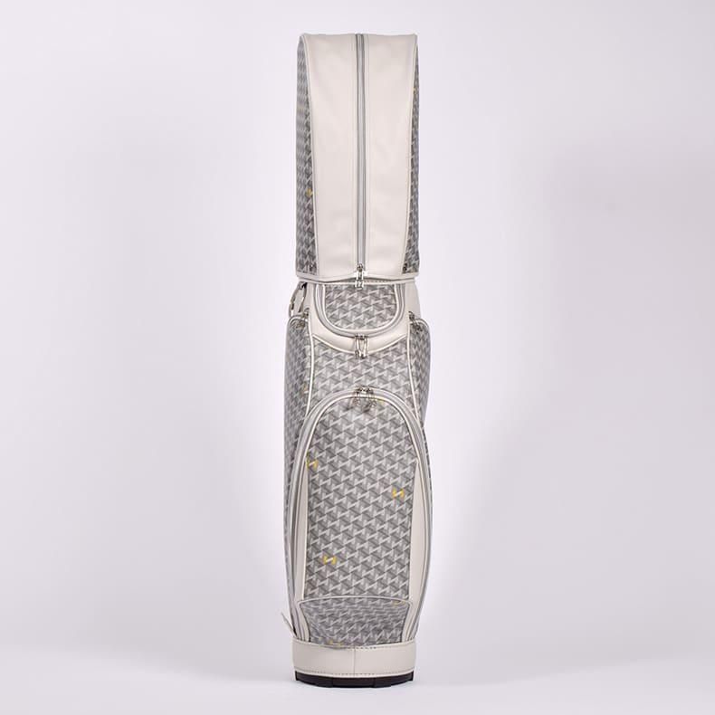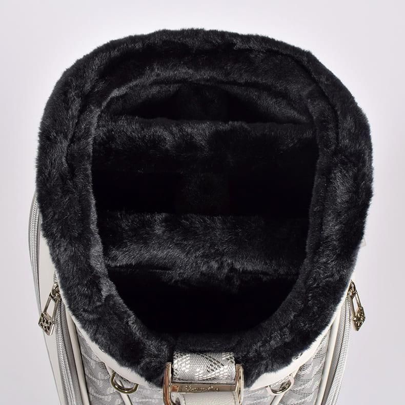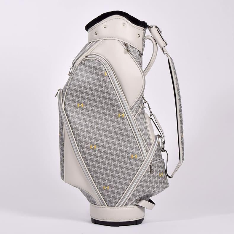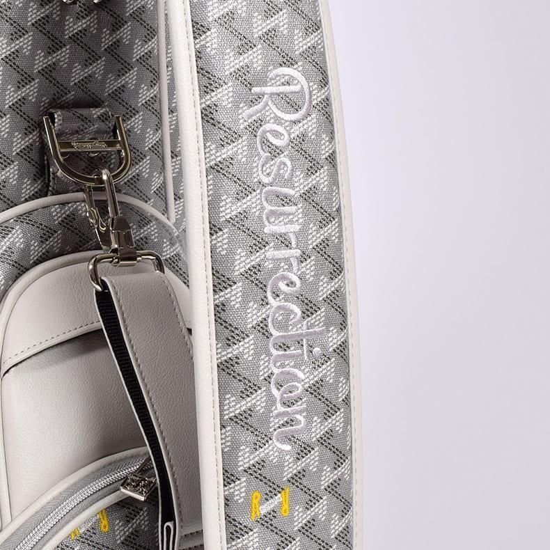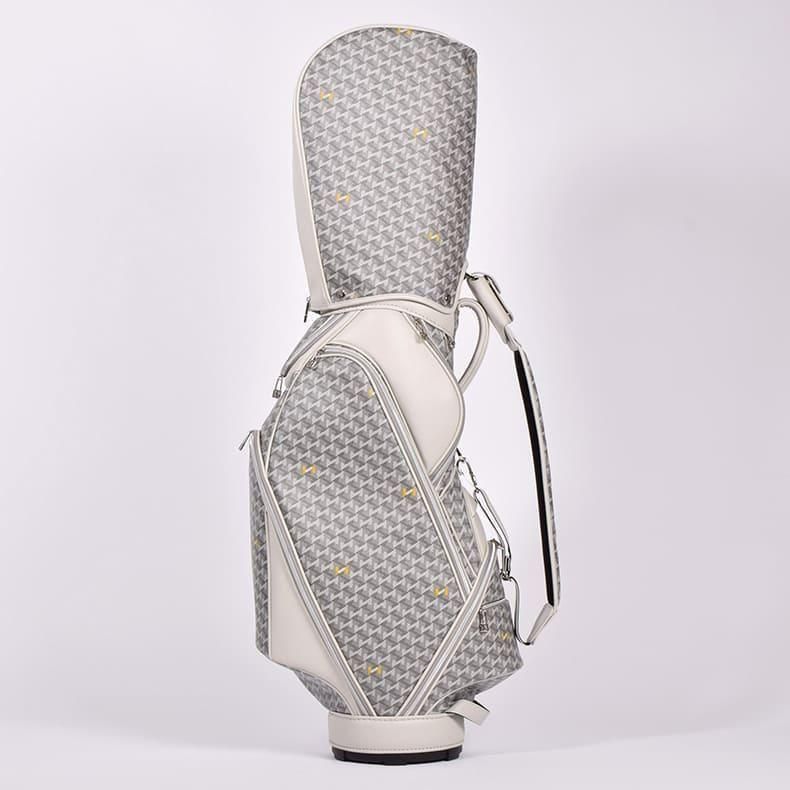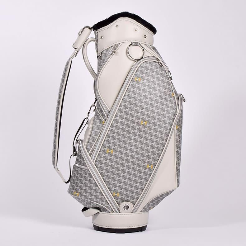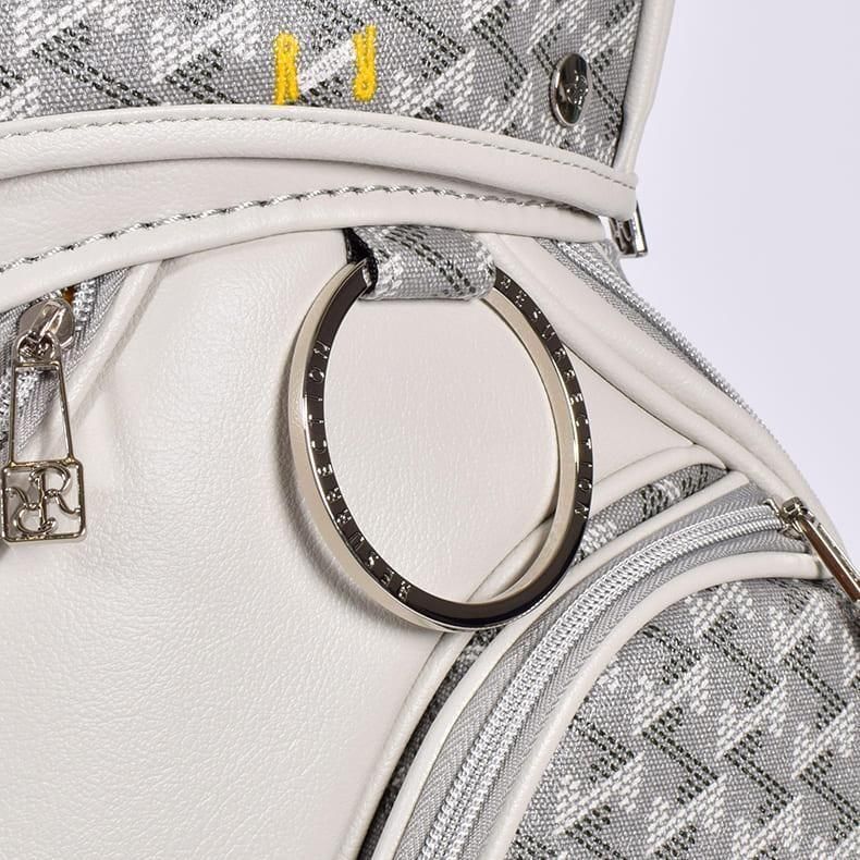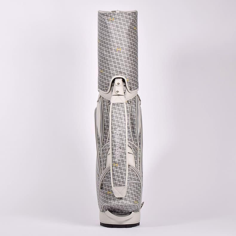 中心にはブランドロゴをあしらい全体的に角を出したデザインの金属パーツが加わることで、キャディバッグの雰囲気がグッと引き締まり、一気に高級感がアップ致しました。