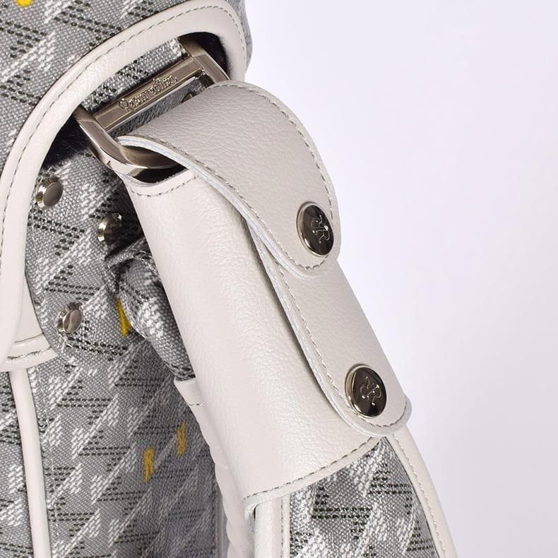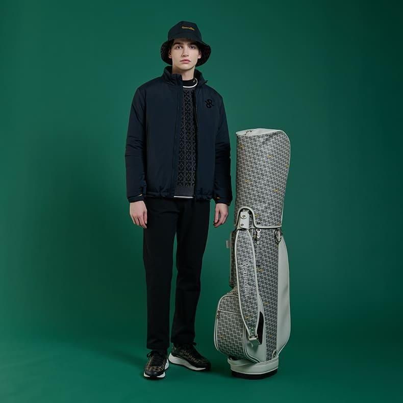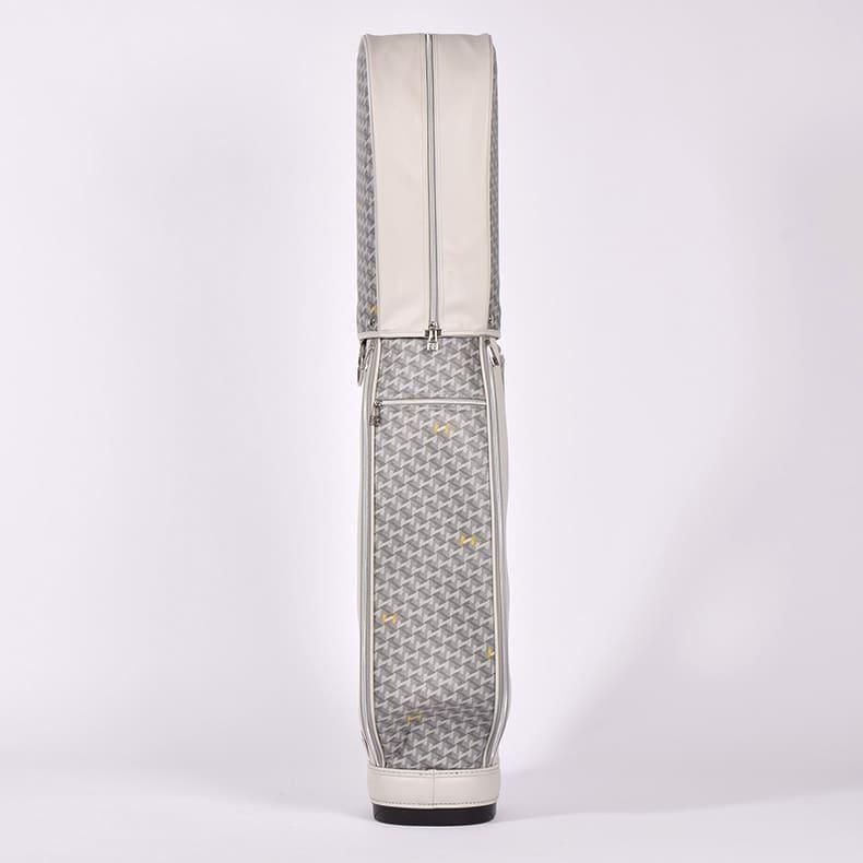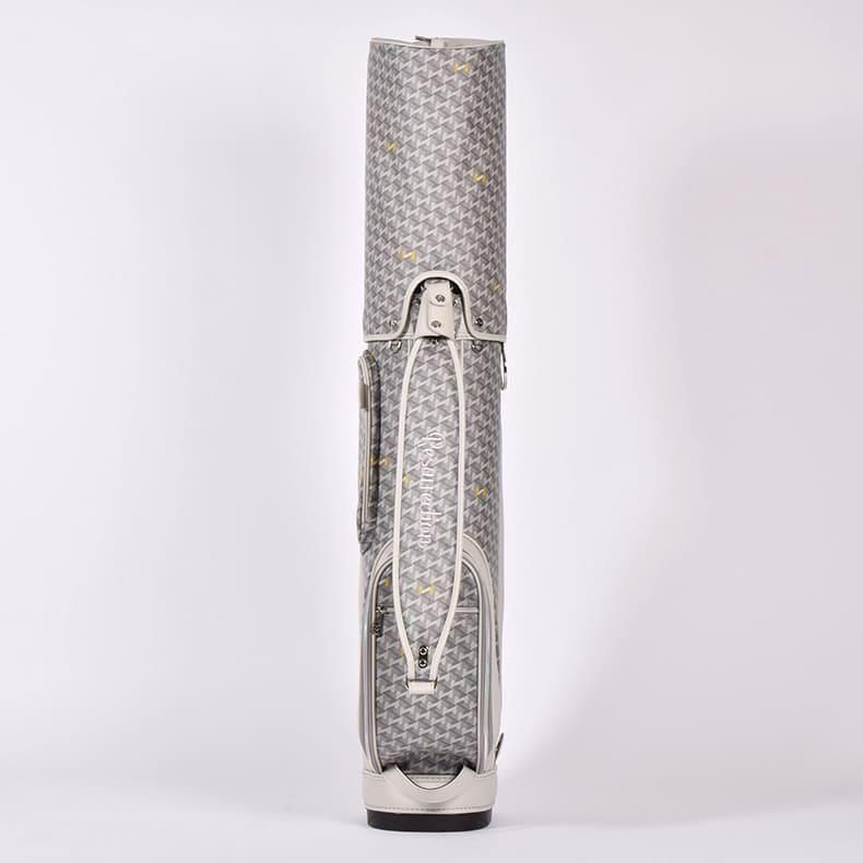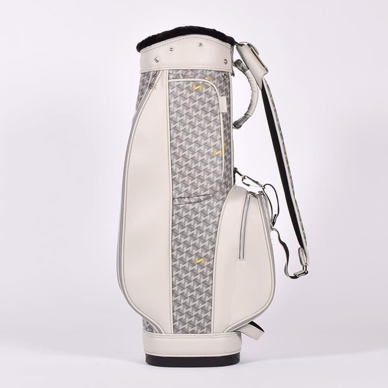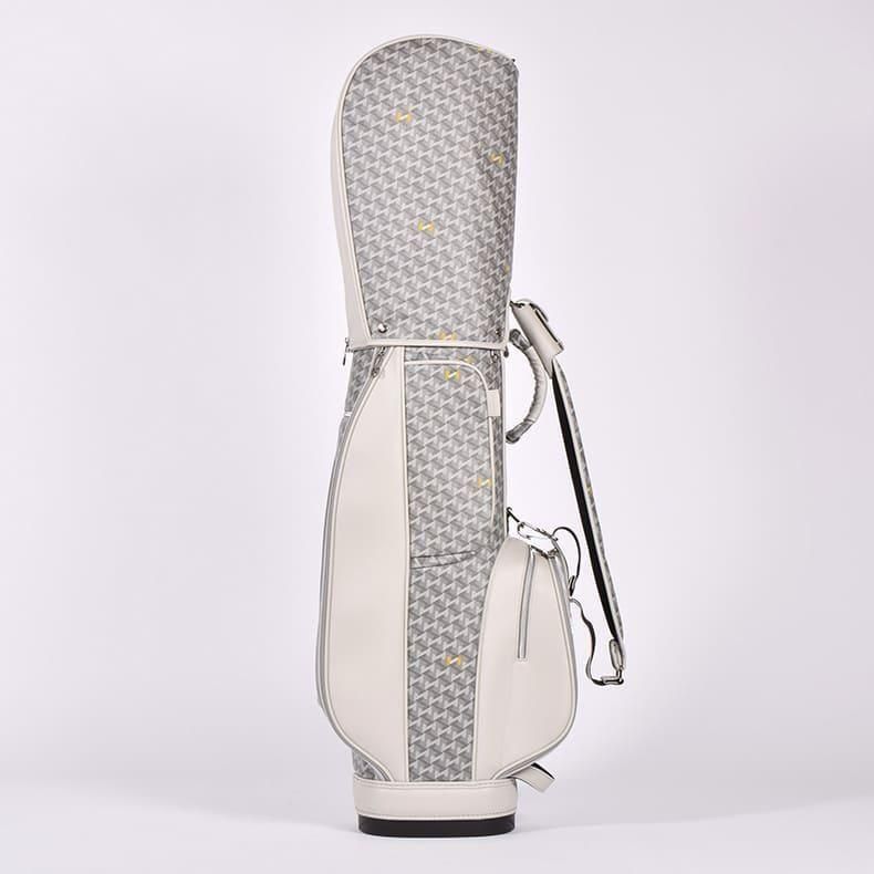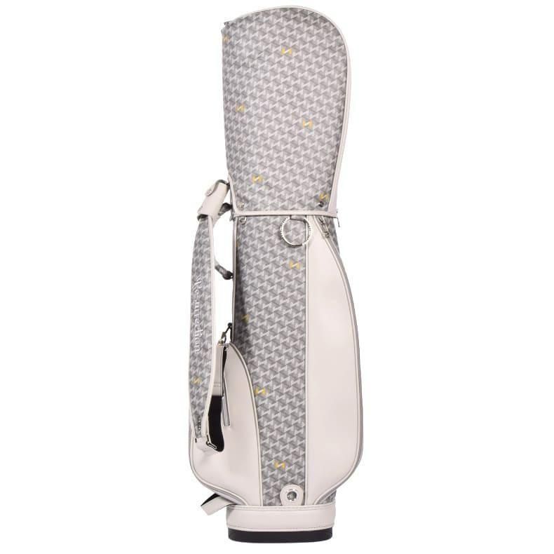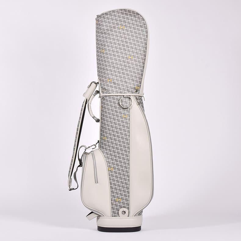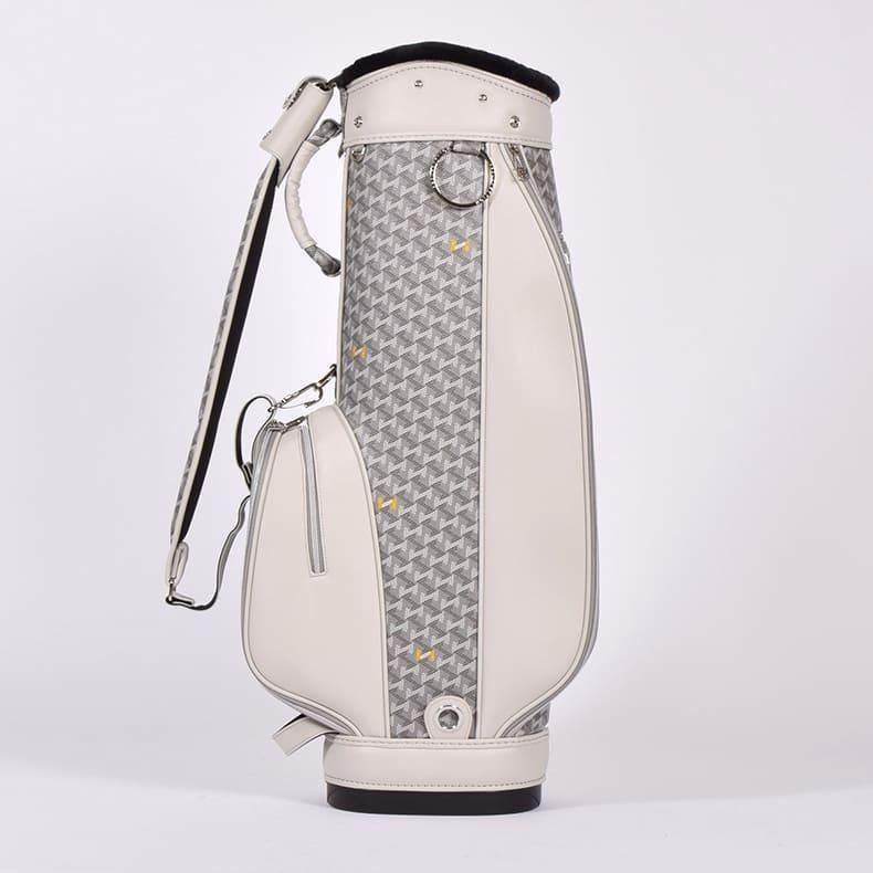中心にはブランドロゴをあしらい全体的に角を出したデザインの金属パーツが加わることで、キャディバッグの雰囲気がグッと引き締まり、一気に高級感がアップ致しました。