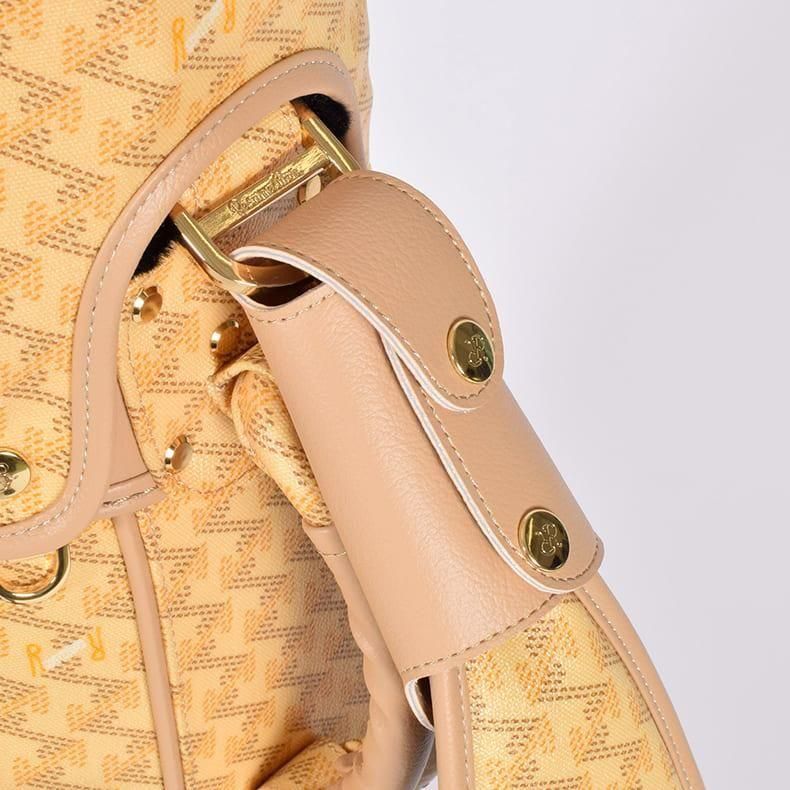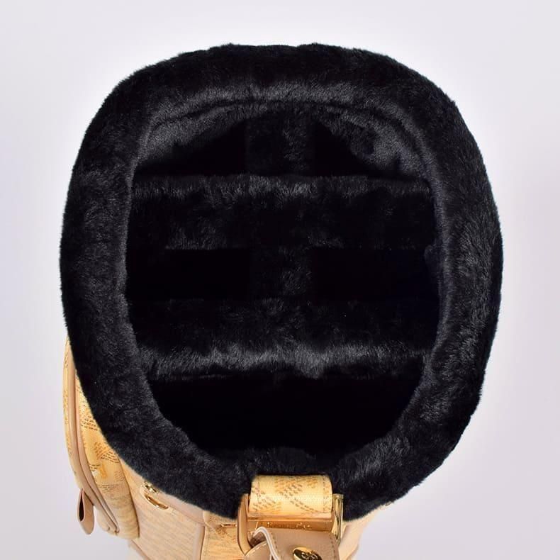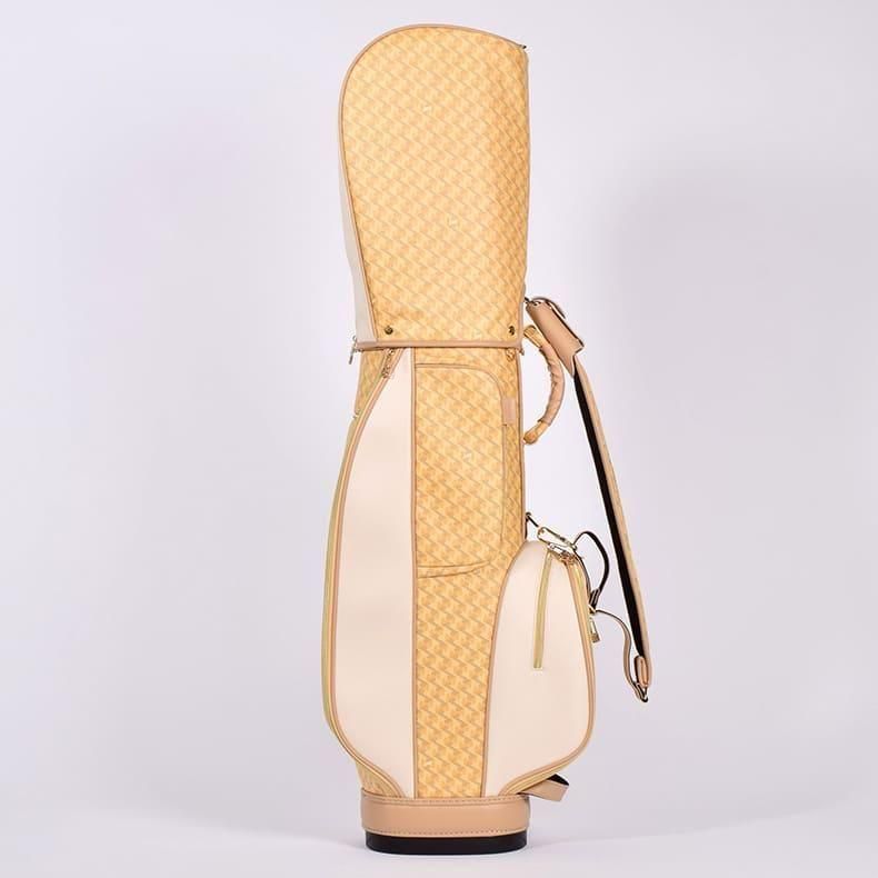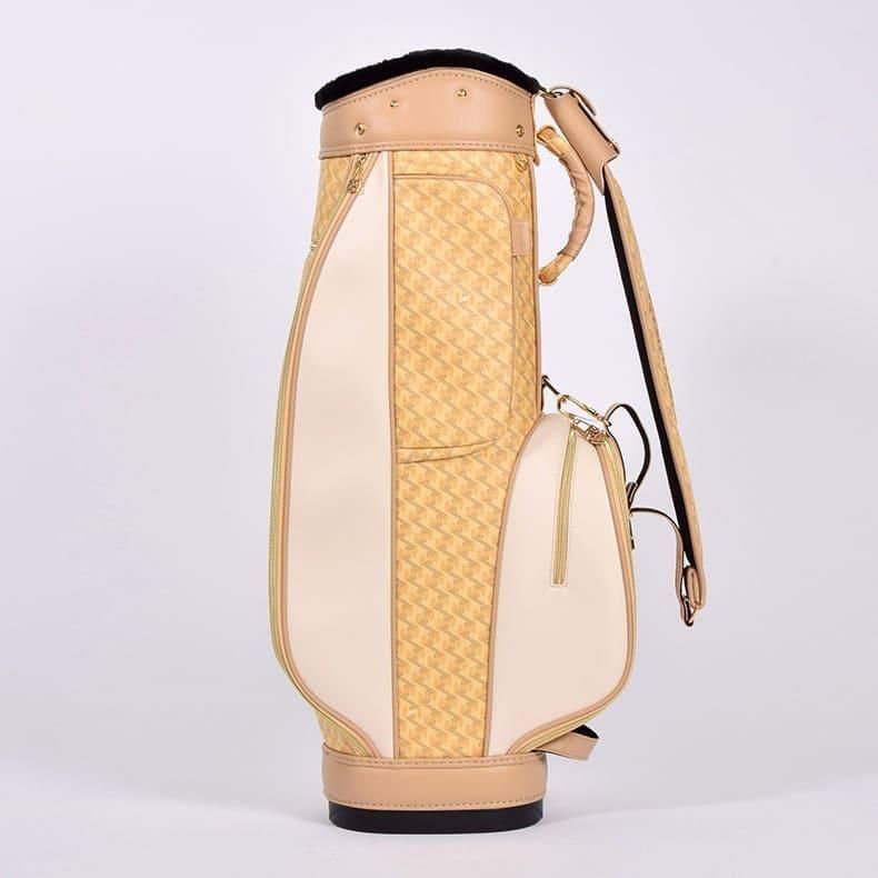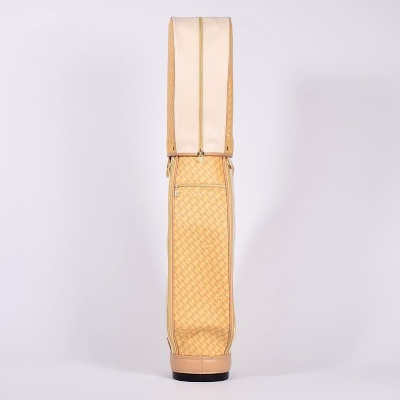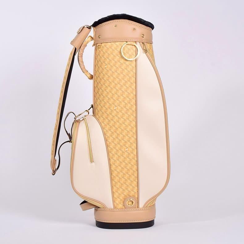 中心にはブランドロゴをあしらい全体的に角を出したデザインの金属パーツが加わることで、キャディバッグの雰囲気がグッと引き締まり、一気に高級感がアップ致しました。