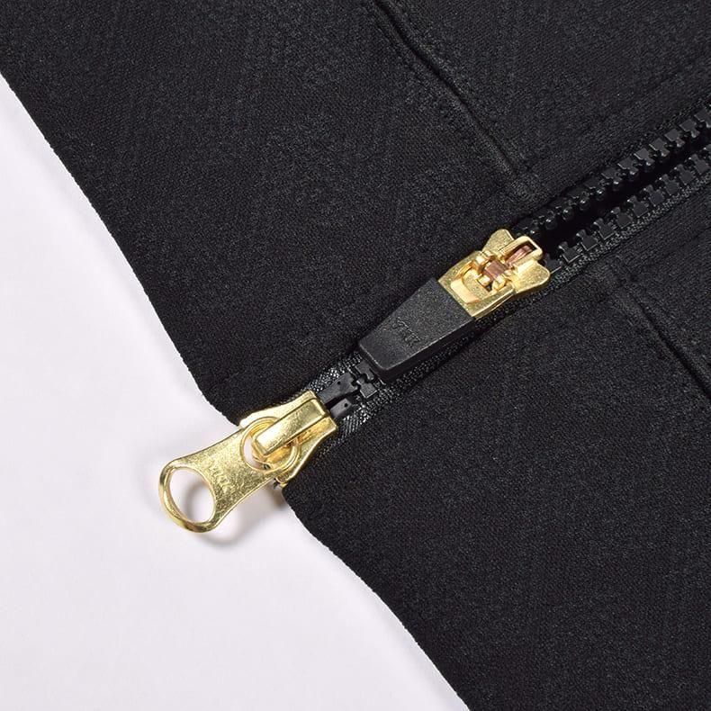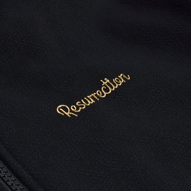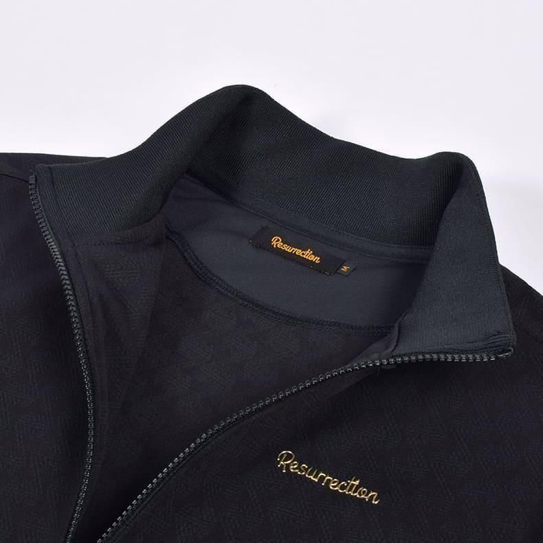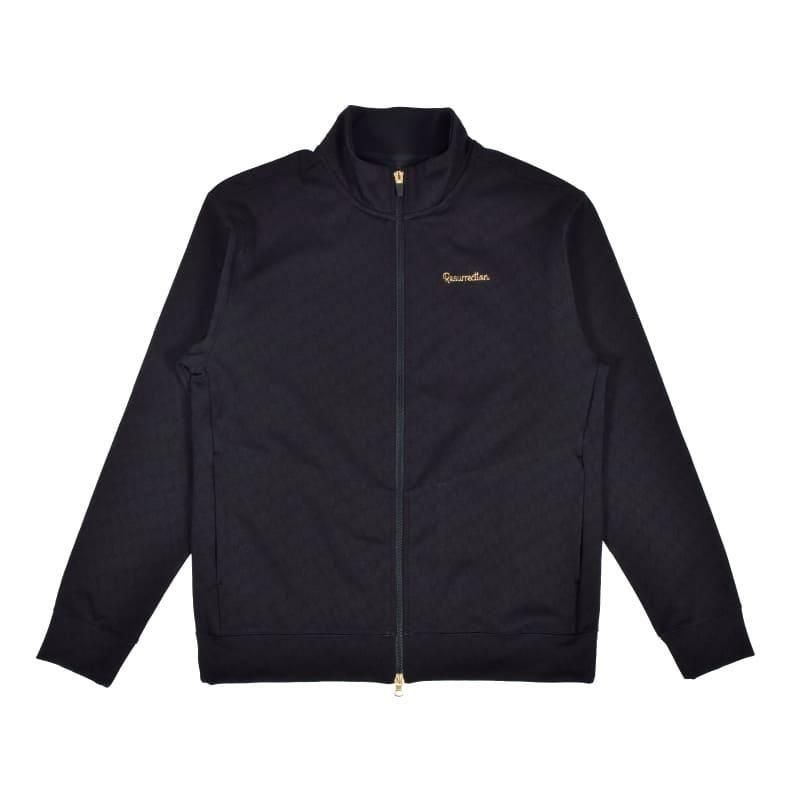 フロントジッパー仕様のスタンドカラーで、ストレッチ性のある生地感。そこに、レザレクション柄を編みで表現したオリジナルファブリックを落とし込むことによりレザレクションらしいジャケットが完成いたしました。