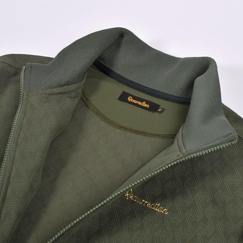 フロントジッパー仕様のスタンドカラーで、ストレッチ性のある生地感。そこに、レザレクション柄を編みで表現したオリジナルファブリックを落とし込むことによりレザレクションらしいジャケットが完成いたしました。