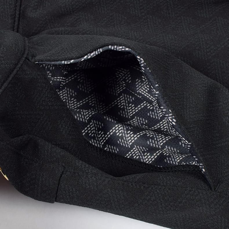 こだわったのは何気ない瞬間に隙間からのぞくオシャレ感。ポケットの内生地や、腰回りの内側にレザレクションの代名詞である幾何学模様をプリント。