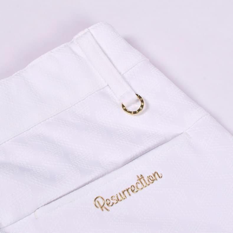 こだわったのは何気ない瞬間に隙間からのぞくオシャレ感。ポケットの内生地や、腰回りの内側にレザレクションの代名詞である幾何学模様をプリント。