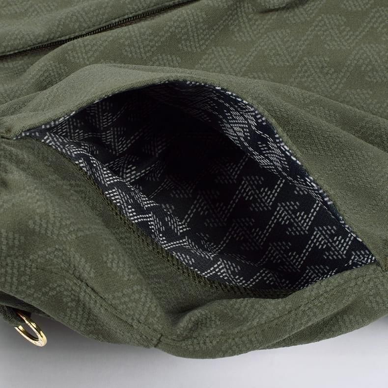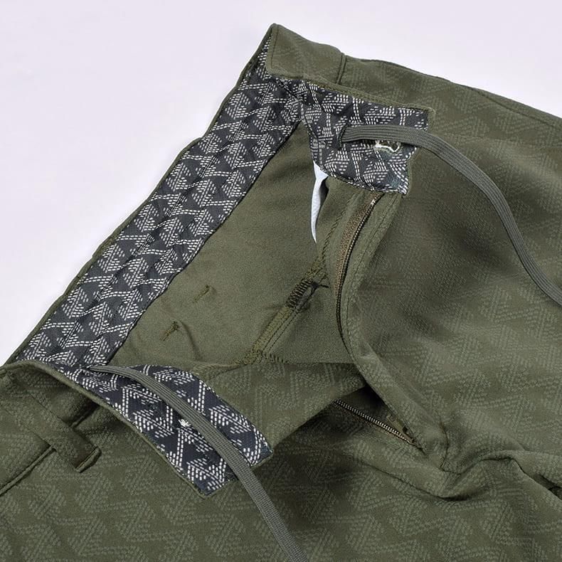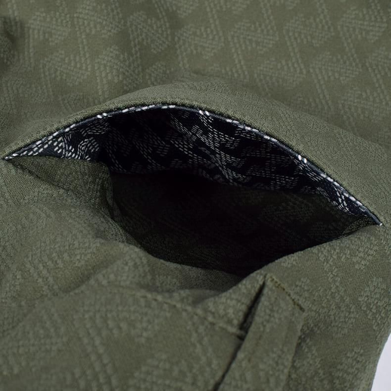 こだわったのは何気ない瞬間に隙間からのぞくオシャレ感。ポケットの内生地や、腰回りの内側にレザレクションの代名詞である幾何学模様をプリント。