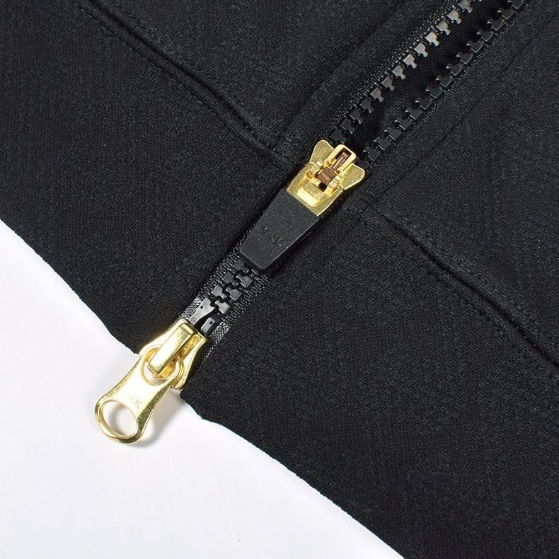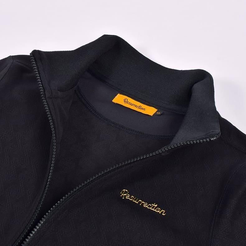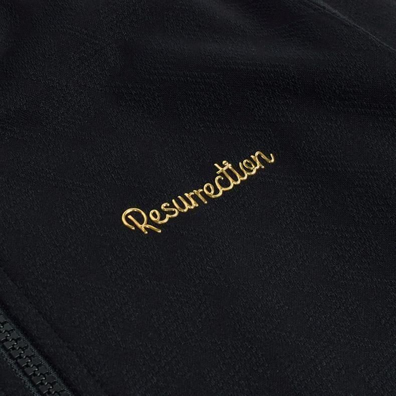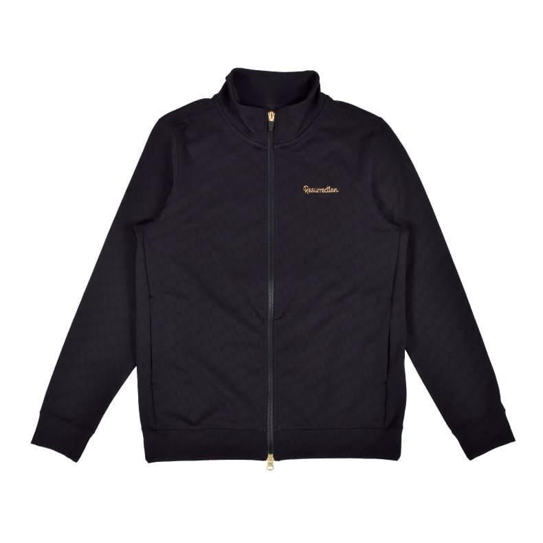 フロントジッパー仕様のスタンドカラーで、ストレッチ性のある生地感。そこに、レザレクション柄を編みで表現したオリジナルファブリックを落とし込むことによりレザレクションらしいジャケットが完成いたしました。