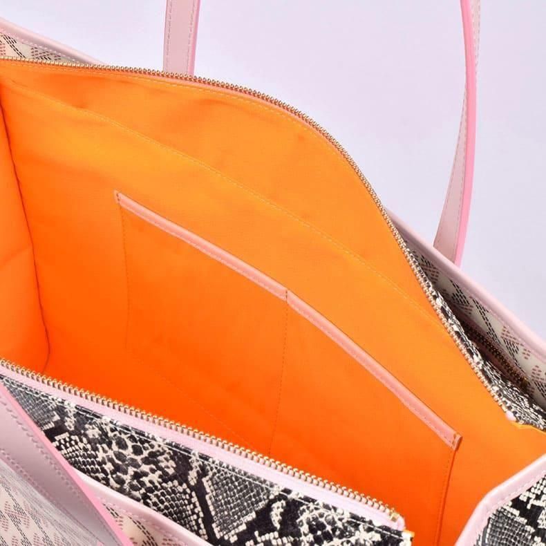 側面や開口部にあしらわれたパイソン柄がラグジュアリーな存在感を放ち、光沢感のあるレザレクション生地が洗練された艶感を演出。シンプルなコーディネートも、これ一つで華やかに仕上がります。
