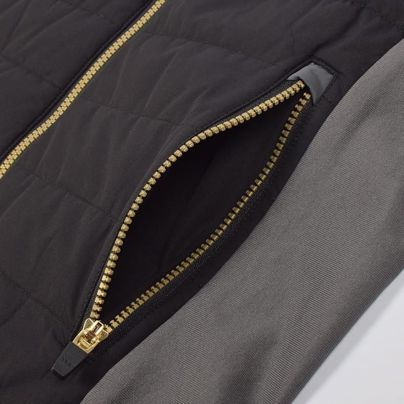 前身頃にはキルティングの中綿素材、サイドにはストレッチ性のある生地を組み合わせた2トーンデザイン。異素材の切り替えが立体感を生み、どの角度から見てもスタイリッシュに。