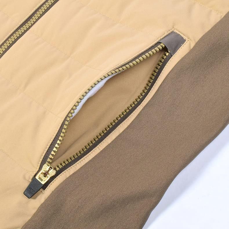 前身頃にはキルティングの中綿素材、サイドにはストレッチ性のある生地を組み合わせた2トーンデザイン。異素材の切り替えが立体感を生み、どの角度から見てもスタイリッシュに。