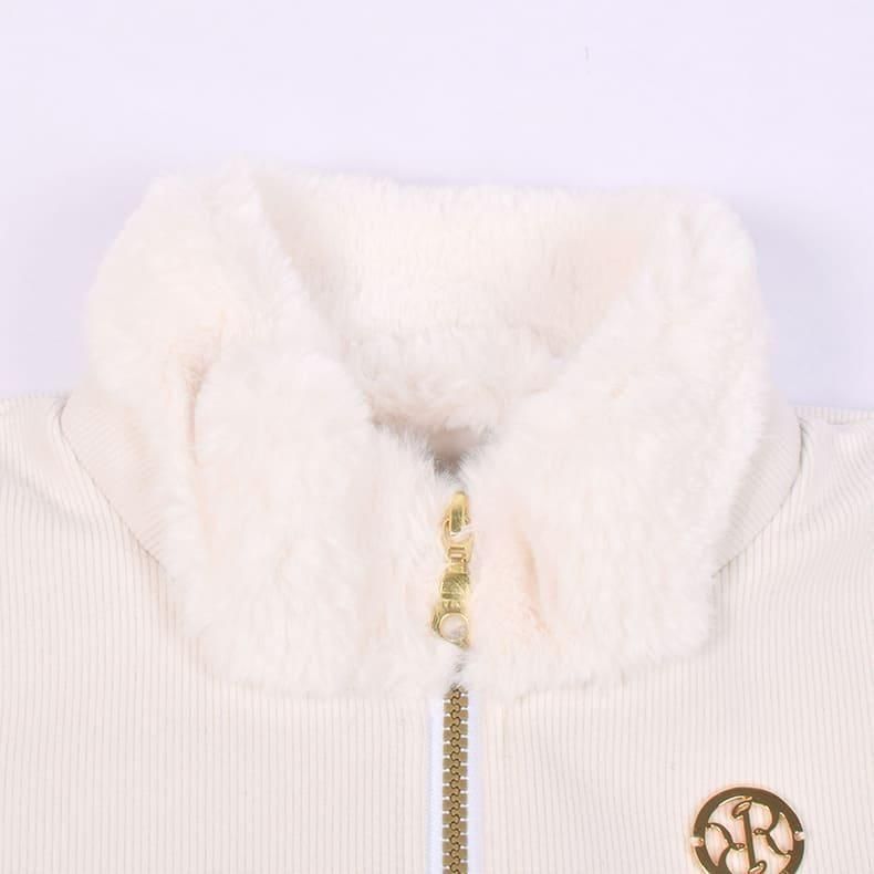 身頃の上部には、温かみとストレッチ性のあるリブ調素材を、下部にはふんわり柔らかなフェイクファーを組み合わせたデザイン。